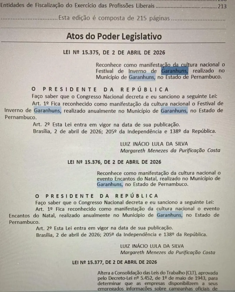 O presidente Luiz Inácio Lula da Silva sancionou na última quinta-feira, 02 de abril, dois projetos de Lei de autoria do deputado federal Felipe Carreras, do PSB-PE, que reconhecem o Festival de Inverno de Garanhuns e o evento Encantos do Natal de Garanhuns como Manifestação Cultural Nacional. A sanção dos dois projetos de Lei foram publicados no Diário Oficial da União desta segunda-feira, 06 de abril de 2026.