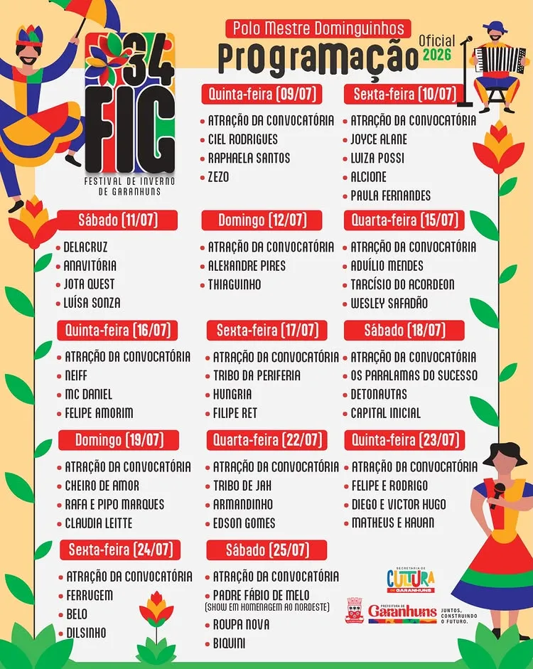 Serão 13 noites temáticas com grandes nomes da música brasileira, contemplando ritmos como forró, pop, rock, MPB, samba, brega, rap, trap e reggae. Entre eles, sobem ao palco do Polo Mestre Dominguinhos, Alcione, Paralamas do Sucesso, Roupa Nova e Tribo de Jah.